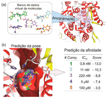 ![]() Figura 6. Representaçao típica do ancoramento de um banco de dados virtual de moléculas dentro do sítio ativo de determinada proteína alvo: (a) definiçao da regiao do sítio ativo considerada no ancoramento e (b) as duas etapas envolvidas no ancoramento (prediçoes da pose e da afinidade). Ancoramento realizado usando o programa FRED141 e cinco compostos do banco de dados ChEMBL ativos frente a enzima alvo ECA. A estrutura da ECA foi obtida diretamente do PDB (código 1O86, resoluçao de 2,0 Å)118 e os compostos 1 a 5 correspondem ao CHEMBL110925, CHEMBL1560, CHEMBL1907752, CHEMBL409920 e CHEMBL2092878, respectivamente