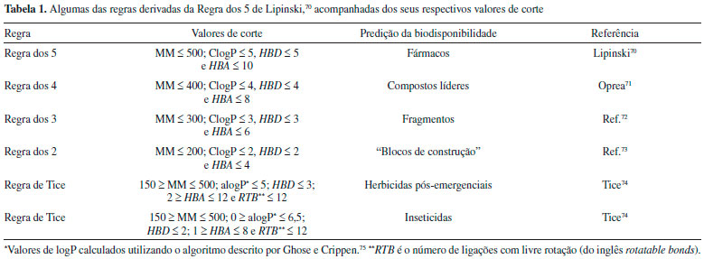 FILTROS UNI- OU BIDIMENSIONAIS Os filtros de seleçao podem ser uni- ou bidimensionais, com base nas propriedades físico-químicas e/ou na conectividade dos átomos, sendo eles, por exemplo, filtros de propriedades "fármaco-similar", filtros de características estruturais e filtros de similaridade 2D. Filtros de propriedades "fármaco-similar" A ideia de usar propriedades "fármaco-similar" (do inglês "drug-like") como filtro de seleçao na busca virtual vem da observaçao de que fármacos apresentam certas propriedades físico-químicas e/ou estruturais que os distinguem dos demais compostos. Dentre as características desejadas para um fármaco podemos citar: ser solúvel em água e ser, de preferência, biodisponível por via oral. Um dos trabalhos pioneiros no sentido de identificar quais propriedades físico-químicas de um composto estao relacionadas com uma adequada biodisponibilidade oral foi desenvolvido por Lipinski e colaboradores em 1997. Neste trabalho,70 Lipinski analisou 2.245 fármacos que apresentavam uma boa biodisponibilidade oral (absorçao ou permeabilidade), utilizando quatro parâmetros físico-químicos que já haviam sido associados com medidas de permeabilidade, sendo eles: massa molecular, coeficiente de partiçao octanol/água calculado (usando o programa ClogP), número de átomos doadores de ligaçao de hidrogênio (soma dos átomos O-H e N-H) e número de átomos aceptores de ligaçao de hidrogênio (soma dos átomos O e N). Cerca de 90% dos compostos analisados apresentam massa molecular (MM) ≤500 g/mol, ClogP ≤5, número de átomos doadores de ligaçao de hidrogênio (HBD, do inglês hydrogen bond donor) ≤5 e número de átomos aceptores de ligaçao de hidrogênio (HBA, do inglês hydrogen bond acceptor) ≤10. E menos de 10% dos compostos analisados apresentam dois parâmetros fora da faixa descrita acima. Baseado nestes resultados, Lipinski sugeriu que compostos que apresentem dois ou mais parâmetros com valores fora destas faixas de corte têm grande chance de serem pouco permeáveis. A aplicaçao destes quatro parâmetros, acompanhadas dos valores de corte descritos acima, é chamada de "Regra dos 5" de Lipinski. Desde sua publicaçao em 1997, o artigo de Lipinski foi citado mais de 4.900 vezes (segundo o Scopus, acessado em agosto de 2017). Atualmente, a "Regra dos 5" de Lipinski é amplamente difundida na área da Química Medicinal, sendo usada rotineiramente nos protocolos de descoberta de fármacos.10,26,36 Uma série de outras regras para prever a biodisponibilidade oral foi derivada da regra de Lipinski, sugerindo-se, no entanto, diferentes valores de corte de acordo com os tipos de compostos analisados. A Tabela 1 mostra algumas das regras derivadas da "Regra dos 5".