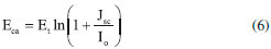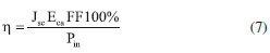 As medidas de absorçao/adsorçao foram realizadas em um espectrofotômetro UV-Vis- 320G, Gehaka, em 540 nm, a 25 °C, com fins de se determinar a capacidade máxima de adsorçao do corante na superfície do semicondutor e a regiao de absorçao do corante no espectro eletromagnético. Os valores encontrados, foram utilizados para os cálculos das concentraçoes finais das soluçoes e da quantidade do fotossensibilizante adsorvida no TiO2. Para garantir uma perfeita adsorçao, o tempo de equilíbrio utilizado foi de 24 horas.21-23 Sendo que a capacidade de adsorçao no equilíbrio, da célula de TiO2 com corante natural, foi calculada utilizando a Equaçao 5.19,20 ![]() onde: Co = concentraçao inicial em soluçao (mg L-1); Ce = concentraçao medida após o tempo de equilíbrio em soluçao (mg L-1); m = massa de TiO2 (g); V = volume da soluçao (L). Caracterizaçao das células solares As medidas eletroquímicas foram obtidas em um potenciostato Zahner modelo Zennium Eletrochemical Workstation, acoplado ao Xpot e LOT Oriel- Quantum Design GmbH- simulador solar, com lâmpada de Xenônio e diâmetro do feixe de 25 nm. A potência solar utilizada foi de 100 mW cm-2, a 25 °C em uma área da célula de 0,2 cm2, com um espectro solar padrao a AM1.5G. O potencial de circuito aberto (Eca) pode ser calculado através da Equaçao 6. É um parâmetro extremamente utilizado para caracterizaçao de CSSC e é independente da área da célula e constante sobre temperatura e iluminaçao.4,7,9 ![]() Em que, Et é a voltagem térmica, Io é o fluxo de elétrons irradiados e Jsc a corrente de curto circuito. O potencial de circuito aberto foi alcançado quando o Eca se manteve constante em uma variaçao de ±0,10 mV por 30 segundos. A fotocronoamperometria foi realizada durante 660 segundos, sendo a fonte de iluminaçao interrompida e restabelecida a cada 60 segundos, com o objetivo de verificar a capacidade de injeçao de cargas e a forma de carregamento e descarregamento da célula solar.20 As curvas de densidade de corrente em funçao do potencial (jxE) foram utilizadas, com o propósito de se obter os parâmetros fotovoltaicos necessários para cálculo da eficiência energética do sistema produzido, através da Equaçao 7.4 ![]() Em que η representa a eficiência energética, Jsc a corrente de curto circuito, Eca o potencial de circuito aberto, FF o fator de preenchimento e Pin a potência incidente.