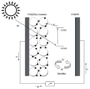 ![]() Figura 1. Esquema de funcionamento da CSSC, formada por TiO2 + corante, com eletrólito contendo par redox I-/I3- , sendo () a representaçao da molécula do corante, (O) moléculas de TiO2 e (e-) elétrons que percorrem o sistema