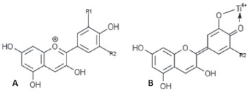 ![]() Figura 2. (A) Estrutura química geral das antocianidinas presente no Hibiscus e (B) Esquema de quelataçao das antocianidinas na superfície de partículas de TiO2
