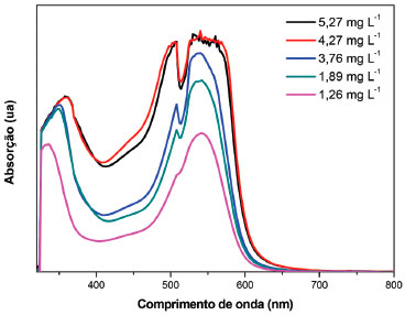 ![]() Figura 5. Espectros UV VIS para as diferentes soluçoes do corante preparadas