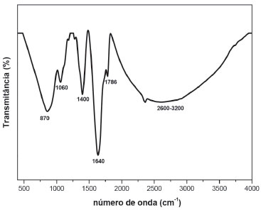 De acordo com o espectro IV-TF (Figura 6) é possível observar bandas intensas na regiao de 870 cm-1, 1060 cm-1 1400 cm-1, 1640 cm-1,1786 cm-1 e uma banda larga na regiao de 2600 cm-1 a 3400 cm-1 que comprovam a presença do corante no filme de TiO2 analisado.25-28 A banda na regiao de 870 cm-1 refere-se à presença de ligaçoes CH=CH229 e banda na regiao de 1060 cm-1 está relacionada com a presença de grupos coordenantes OH na estrutura do corante.29 Já na regiao de 1400 cm-1 tem-se presença de grupos CH2 e de CN.29 Em 1640 cm-1 é atribuída à presença de alcenos conjugados e do estiramento C=C de aromáticos.29 A banda na regiao de 1786 cm-1 comprova a presença de carbonilas (C=O) na estrutura do corante.29 A banda encoberta na regiao de 2600 cm-1 se refere ao grupo - CHO presente na estrutura das antocianidinas e na regiao próxima a 3200 cm-1 é característica da presença do OH livre.20,29-31Estiramentos característicos de óxidos surgem nas regioes baixas do espectro de infravermelho e foram encobertas pela presença do corante.25-27 Na Figura 7A-D se encontram as curvas obtidas para os modelos de isotermas empregados, sendo o melhor ajuste no equilíbrio determinado pelo coeficiente de correlaçao linear (R2) e na Tabela 3, sao apresentados os valores dos coeficientes de correlaçao para os sistemas com o TiO2 com corante extraído do Hibiscus.