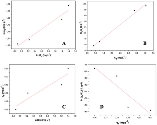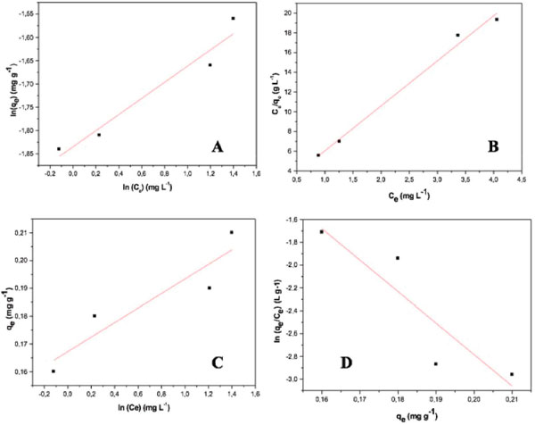 Figura 7. Ajustes dos modelos lineares de isoterma para (A) Freundlich, (B) Langmuir, (C) Temkin e (D) Elovich
