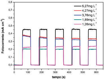 ![]() Figura 9. Medidas de fotocronoamperometria obtidas para as CSSC contendo filmes de TiO2/corante preparados a partir de soluçoes de corante com diferentes concentraçoes, sob iluminaçao de 100 mW cm-2