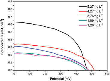 ![]() Figura 10. Curvas de densidade de fotocorrente vs potencial para as CSSC contendo filmes de TiO2/corante preparados a partir de soluçoes de corante com diferentes concentraçoes, sob iluminaçao de 100 mWcm-2