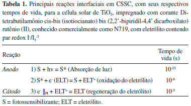 O anodo do dispositivo é formado por um material semicondutor nanocristalino, depositado em um substrato condutor e impregnado por um fotossensibilizante. O contra eletrodo, geralmente formado por platina é o responsável por receber os elétrons, fechando o circuito. E por usa vez, o eletrólito, realiza a intermediaçao de cargas, ou seja, sofre reduçao, para regenerar o corante e se oxida posteriormente, recebendo os elétrons oriundos da platina. Estas reaçoes, com seus respectivos tempos de vida sao apresentados na Tabela 1.3,4