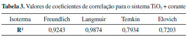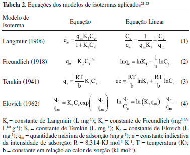 Avaliaçao da adsorçao do corante Para verificar a presença do corante no filme de TiO2, foram realizadas medidas de espectroscopia vibracional na regiao do infravermelho com transformada de Fourier (IV- TF), com pastilha de KBr 10% em um espectrofotômetro infravermelho de feixe duplo por transformada de Fourier, marca Agilent Tecnologies, modelo Cary 600 Series FTIR, faixa espectral de 4000 cm-1 a 400 cm-1. Os modelos de adsorçao sao ferramentas úteis para o estudo de mecanismos de coordenaçao de moléculas em determinadas superfícies, fornecendo uma visao mais detalhada do equilíbrio requerido para que a interface TiO2/Corante se complete, levando consequentemente a uma melhor caracterizaçao dos sistemas estudados.19 Isotermas, como de Langmuir, Freundlich, Temkin e Elovich sao modelos que se aplicáveis, cada qual com suas determinadas características, fornecem constantes e a capacidade máxima de adsorçao fazendo com que seja possível um estudo mais detalhado do caso.20 Na Tabela 2 sao apresentados os modelos de isotermas de adsorçao aplicados, com suas respectivas equaçoes.19,20
