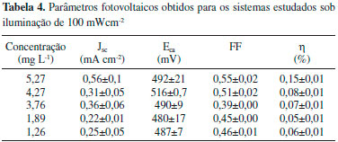 A medida de fotocronoamperometria mostrou que todas as células produzidas sao fotossensíveis, pois sob iluminaçao houve um aumento da corrente e ao se interromper a fonte de luz, a corrente foi reduzida drasticamente. Percebe-se também uma excelente carga e descarga do dispositivo, pois seu carregamento/descarregamento foi instantâneo (aumento de corrente/diminuiçao da corrente). Verifica-se através da fotocronoamperometria, que nao houve uma degradaçao acelerada do corante com a incidência da luz, visto que a corrente se mantém em patamares próximos durante o tempo analisado de 600 segundos. É esperado que células solares sensibilizadas por corante natural sofram degradaçao mais rápida quando comparado ao uso de corantes comerciais, porém Patrocínio e Ilha3 demonstraram que corantes naturais extraídos da amora sao capazes de manterem os parâmetros fotovoltaicos estáveis por até 20 semanas, sem sofrerem qualquer tipo de deterioraçao.3 O melhor valor de fotocorrente obtido foi para a célula com maior quantidade de corante, num valor próximo de j=0,45 mA cm-2. O menor valor de fotocorrente obtido foi para a célula produzida com corante a uma concentraçao de 1,89 mg L-1, com j=0,20 mA cm-2, comprovando que quanto mais baixa a concentraçao do corante, menor o fluxo de elétrons que percorre o sistema, devido à menor quantidade de moléculas de corante adsorvidas no filme de TiO2. Estes valores mais baixos de corrente, quando comparado a outras literaturas, podem ser devido ao uso do eletrólito líquido utilizado, visto que nao foram utilizados materiais que garantiram um selamento eficiente do dispositivo.2,3 Na Figura 10 sao apresentadas as curvas jxE para as células estudadas e na Tabela 4 os parâmetros fotovoltaicos.