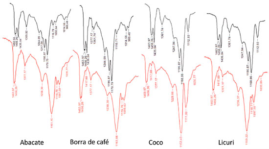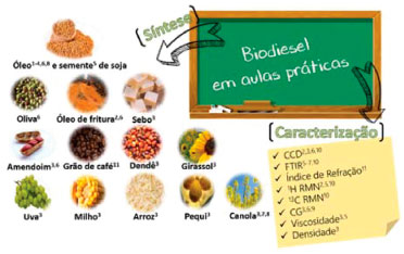 ![]() Figura 1. Biomassas empregadas na síntese de biodiesel em aulas experimentais e caracterizaçoes típicas