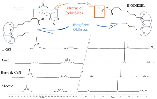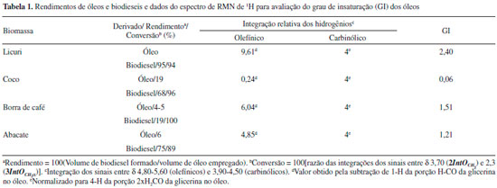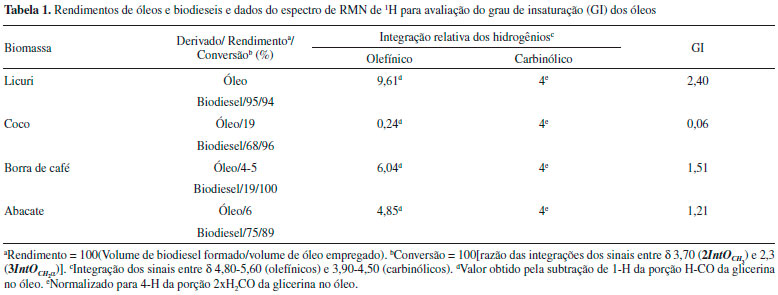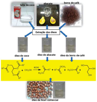 PARTE EXPERIMENTAL Os espectros na regiao do infravermelho foram obtidos na forma de filme (ATR) em um aparelho SHIMADZU IR Affinity-1, e os espectros de RMN (CDCl3) foram obtidos em 90 MHz para 1H empregando o aparelho Anasazi Eft-90. Abacate, pó de café, leite de coco e óleo de licuri foram adquiridos em mercado local. Extraçao do óleo de abacate Amasse de forma mecânica, com auxílio de um garfo, 200 g de polpa de abacate até textura homogênea. Transfira para uma forma de alumínio e distribua pela superfície até formar uma fina camada. Aqueça em estufa a 60 °C por 12 h. Transfira a polpa desidratada para um extrator Soxhlet acoplado a um balao de 500 mL, contendo 300 mL de hexano. Após 4 extraçoes cessar o aquecimento, resfrie o balao até temperatura ambiente e elimine o hexano em um evaporador rotatório. Foi obtido 14 mL de um óleo verde. Extraçao do óleo da borra de café Após preparar a bebida do café, coloque a borra para secar ao ar dois dias e acondicione na geladeira para evitar proliferaçao de fungos. Pese 50 g da borra de café em um Erlenmeyer de 500 mL e adicione 200 mL de hexano. Aqueça a mistura em placa por 45 min com leve fervura em capela com exaustao. Filtre em papel de filtro e transfira o filtrado para um balao previamente pesado. Elimine o hexano em evaporador rotatório e pese o balao contendo o óleo. Foram obtidos 2,34 ± 0,21 g, equivalente a 2,05 ± 0,15 mL de óleo, numa triplicata. Extraçao do óleo a partir do leite de coco Pese 300 g de leite de coco comercial (marca SOCOCO) e transfira para recipiente de vidro temperado. Cubra o recipiente com filme de PVC, faça pequenos furos na superfície e coloque em forno micro-ondas doméstico. Deixe evaporar a água do leite de coco por aproximadamente 23 min em potência máxima. A cada intervalo de 5 min pare o aquecimento, abra a porta do forno de micro-ondas e deixe esfriar por 1 min. Ao término da evaporaçao deixe o recipiente de vidro esfriar (CUIDADO) até a temperatura ambiente. Filtre o óleo extraído à vácuo com auxílio de carvao ativado e utilize 60 mL de hexano para lavar do resíduo. Transfira o filtrado para um balao previamente pesado, elimine o hexano em evaporador rotatório e pese o balao contendo o óleo. Foram obtidos 58 g de óleo de coco equivalendo a 64 mL. Obtençao de biodiesel do óleo de abacate Em um balao de 50 mL, adicione 10 mL do óleo de abacate e 3,5 mL de soluçao metanólica de KOH previamente preparada com 0,2250 g de KOH e 5 mL de metanol. Adapte a um condensador de refluxo e aqueça a mistura a 45 °C, com agitaçao, por 15 min. Após este tempo transfira para um funil de separaçao, descarte a fase aquosa e faça lavagens sucessivas da fase orgânica com 5 mL de soluçao de HCl a 0,5% (v/v), 5 mL de soluçao saturada de NaCl e por fim lavagem com 5 mL de água destilada. Remova resíduo de água utilizando sulfato de sódio anidro. Transfira o produto para um balao previamente pesado. Foram obtidos 7,5 mL do biodiesel de coloraçao verde. Obtençao de biodiesel do óleo da borra de café Em um balao de 25 mL, adicione 1,5 mL do óleo da borra de café e 0,5 mL de uma soluçao metanólica de KOH previamente preparada com 0,2250 g de KOH e 5 mL de metanol. Adapte a um condensador de refluxo e aqueça a mistura a 45 °C, com agitaçao, por 10 min. Faça a lavagem e secagem da mesma forma descrita para o biodiesel de abacate. Foi obtido 0,3 mL do biodiesel. Obtençao de biodiesel do óleo de coco Em um balao de 25 mL, adicione 1,50 mL do óleo de coco previamente extraído e 1,64 mL de soluçao metanólica de KOH previamente preparada com 0,2250 g de KOH e 5 mL de metanol. Adapte a um condensador de refluxo e aqueça a mistura a 45 °C, com agitaçao, por 10 min. Faça a lavagem e secagem da mesma forma descrita para o biodiesel de abacate. Foi obtido 1,02 mL do biodiesel incolor, com leve odor de coco. Obtençao de biodiesel do óleo de licuri Em um balao de 50 mL, adicione 10 mL do óleo de licuri e 3,5 mL de uma soluçao metanólica de KOH previamente preparada com 0,2250 g de KOH e 5 mL de metanol. Adapte a um condensador de refluxo e aqueça a mistura a 45 °C, com agitaçao, por 15 min. Faça a lavagem e secagem da mesma forma descrita para o biodiesel de abacate. Foram obtidos 9,5 mL do biodiesel, de coloraçao amarela.