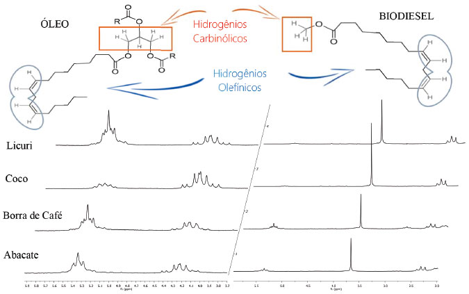 Análise espectral comparativa dos óleos e biodieseis Fontoura e colaboradores, na sua excelente proposta de aula de óleos e gorduras em química orgânica, conduzem os estudantes à realizaçao da análise comparativa de diversas varáveis físico-químicas dos óleos e gorduras e dos biodieseis, inclusive com a análise da mistura dos ésteres metílicos dos biodieseis por cromatografia em fase gasosa.3 Destarte, apesar do significativo valor pedagógico deste trabalho, nao houve a execuçao da análise comparativa das matérias-primas e produtos via IV e RMN. Nos experimentos didáticos que empregam o tema biodiesel e caracterizam o produto e a matéria-prima por IV e/ou RMN, a comparaçao dos espectros do óleo original com o biodiesel é feita para a certificaçao da ocorrência da reaçao química, nao explorando o potencial didático da comparaçao entre os vários óleos e entre seus correspondentes biodieseis. A maioria dessas propostas didáticas emprega RMN para esta caracterizaçao, algumas associam RMN e IV, e poucas usam exclusivamente o IV.5,6,8,18,20 Na proposta dos nossos trabalhos de transposiçao didática para desenvolver experimentos sustentáveis de química orgânica, é crucial que a execuçao seja possível em diferentes contextos de infraestrutura de ensino experimental, com materiais de fácil acesso e que contemplem a existência de mínimo parque instrumental, mas ainda proporcione o máximo valor pedagógico. Assim, empregamos aqui correlaçoes entre IV e RMN, de forma que nos locais onde o acesso a RMN para aulas de graduaçao seja limitado se possa, empregando IV, chegar às mesmas conclusoes. Na Figura 3 sao apresentados os espectros parciais de RMN de 1H dos óleos e seus correspondentes biodieseis (espectros completos no Material Suplementar) obtidos em espectrômetro dedicado ao ensino, onde é possível verificar o desaparecimento dos sinais dos hidrogênios metilênicos carbinólicos da porçao glicerina dos triglicerídeos (OCH2: δ 4,00-4,50 ppm) e o aparecimento do singleto da metoxila no biodiesel (OCH3: δ 3,54 ppm), o que comprova a ocorrência da reaçao de transesterificaçao com metanol.