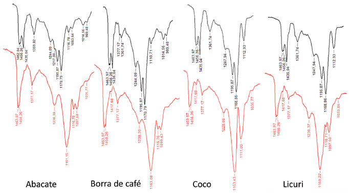 Figura 4. Intervalo dos espectros na regiao do infravermelho (1500-1000 cm-1, ATR) do óleo (abaixo) e o biodiesel (acima) das biomassas alternativas estudadas