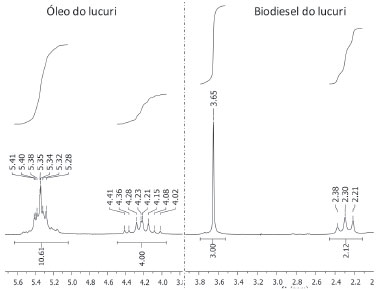 ![]() Figura 5. Intervalos dos espectros de RMN de 1H (CDCl3, 90 MHz) do óleo e do biodiesel do licuri para o cálculo do grau de insaturaçao do óleo e da conversao do biodiesel, respectivamente