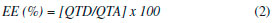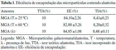 Eficiência de encapsulamento De acordo com os resultados observa-se que a eficiência de encapsulamento da alantoína com a galactomanana foi na proporçao 10:1 (galactomanana:alantoína) e o teor de alantoína incorporado ao sistema polimérico em diferentes condiçoes (Tabela 1). Os referidos dados estao de acordo com os de Carlos Souza e colaboradores quando relataram que a microencapsulaçao do ácido L-ascórbico utilizando galactomanana como agente encapsulante foi de aproximadamente 96%.16