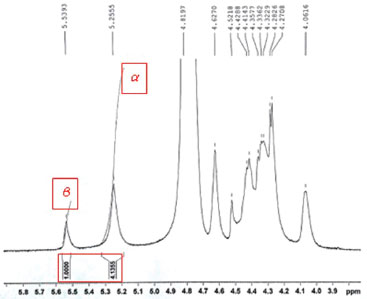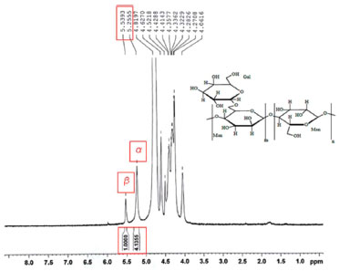 RESULTADOS E DISCUSSAO Caracterizaçao da galactomanana A proporçao de D-manose e D-galactose foi estimada em 4:1 pela medida direta das áreas relativas aos sinais de 1H (Man) e 1H (Gal). Este resultado está de acordo com trabalhos anteriores para outras galactomananas, incluindo a goma da D. regia.16 Com base no assinalamento dos sinais de hidrogênios anoméricos foram identificados os sinais de H de α-D-manose (5,26 ppm) e de β-D-galactose (5,54 ppm) (Figuras 2 e 3).