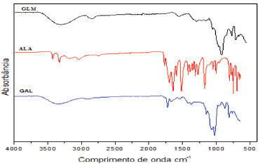 ![]() Figura 4. Espectro do IV da galactomanana (GAL), alantoína (ALA) e das micropartículas de galactomanana/alantoína (GLM)