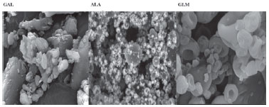 ![]() Figura 5. Micrografia da galactomanana (GAL), alantoína (ALA) e micropartículas de galactomanana/alantoína (GLM)