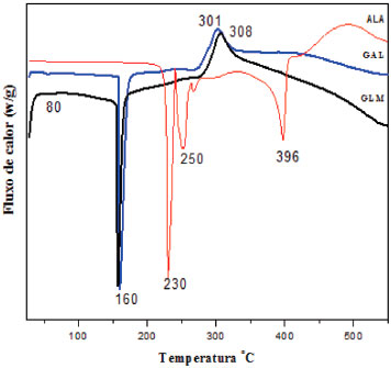 ![]() Figura 6. Termogramas de DSC da galactomanana (GAL), alantoína (ALA) e micropartículas de galactomanana/alantoína (GLM)