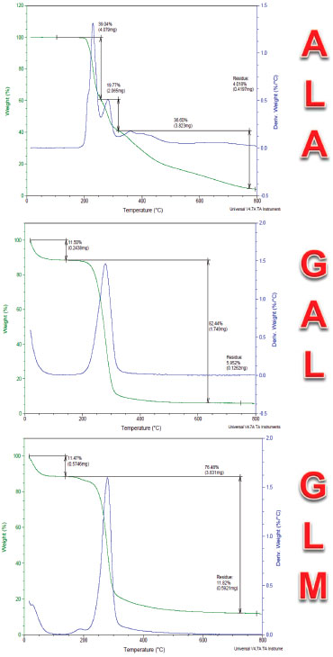 ![]() Figura 7. Perfil de degradaçao comparativo das amostras de alantoína (ALA), galactomanana (GAL) e micropartículas de galactomanana/alantoína (GLM)