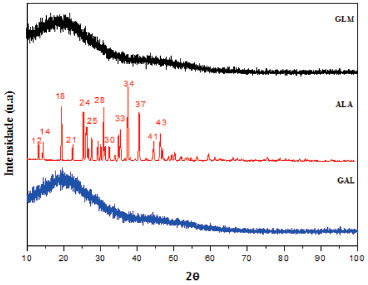 ![]() Figura 8. Difraçao de raios-x da galactomanana (GAL), alantoína (ALA) e microcápsulas galactomanana/alantoína (GLM)