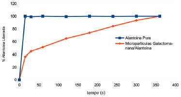 Comportamento semelhante foi observado no trabalho de Devkar e colaboradores,28 os quais produziram carreadores nanoestruturados por freeze dried e também observaram que houve reduçao da intensidade dos picos de DRX da droga, sugerindo a conversao da forma cristalina para a forma amorfa. Ensaio de liberaçao in vitro com dispersao direta no meio A velocidade de liberaçao de fármacos a partir de sistemas microparticulados pode ser influenciada pela combinaçao de diversos fatores, como características da matriz polimérica (espessura, porosidade, capacidade de intumescimento), tamanho das micropartículas, localizaçao do ativo no interior das partículas, das propriedades físico-químicas do fármaco e do polímero.29 Os resultados apresentados demonstraram que o ensaio feito com as micropartículas galactomanana/alantoína configuraram uma liberaçao controlada, uma vez que os desvios-padroes obtidos foram valores bem abaixo dos valores que a Farmacopeia Brasileira preconiza que é correspondente a 5%.29 Com estes resultados, pode-se inferir que as amostras de micropartículas galactomanana/alantoína foram bem elaboradas e, além da liberaçao gradual, tem a vantagem de aumentar o tempo de estabilidade da alantoína. Outro aspecto relevante que se deve inferir com estes resultados é que, ao final das 6 horas do ensaio de liberaçao, o teor final de liberaçao chegou aos 100%, valor este que está de acordo com o intervalo estipulado e permitido pela Farmacopeia Brasileira, os quais podem variar em 85% a 120%.30 Observa-se, ainda, que ocorreu a liberaçao controlada do ativo alantoína através da parede polimérica das micropartículas, ao longo das 6 horas de ensaio, pois a mesma liberou este ativo de forma bastante gradual. Já o ensaio das amostras de alantoína pura chegou à 100% em até 5 minutos (Figura 9).