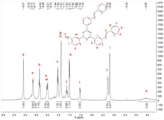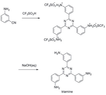 EXPERIMENTAL Materials and apparatus Unless otherwise specified, all starting materials were purchased from commercial sources and used as supplied. Manipulations were performed under normal atmospheric conditions unless otherwise noted. 1H NMR spectra were recorded on a Bruker Avance DPX400 spectrometer; ESI-MS was performed on a Micromass Quattro LC instrument. Electronic absorbance spectra were measured in acetonitrile with a Perkin Elmer Lambda 750 UV−Vis NIR spectrometer. Synthesis of the subcomponent triamine A typical synthesis (Scheme 1) of the subcomponent triamine (3,3',3''- (1,3,5-triazine-2,4,6-triyl) trianiline) follows the procedure below. A solution of 3-aminobenzonitrile (827 mg, 7 mmol) in 30 mL of dichloromethane was stirred in an ice bath to maintain the temperature below -5 °C. Trifluoromethanesulfonic acid (3 ml, 33.3 mmol) was added dropwise and the resulting mixture was stirred under N2 atmosphere for 16 h.29 After the reaction, the yellow layer was separated. Distilled water (50 mL) and 2M NaOH solution were added until pH = 13-14 to afford a pale yellow precipitate. The crude product was filtered, washed twice with distilled water and purified by recrystallization in acetone. Yield 60%. 1H NMR (400 MHz, CD3CN) (Figure 1S): 8.06 (m, 3H), 8.03 (m, 3H), 7.32 (dd, J = 9.8, 5.8 Hz, 3H), 6.93 (ddd, J = 7.9, 2.4, 0.9 Hz, 3H), 4.43 (s, NH2). Found: C, 71.15; H, 5.13; N, 23.70. Calcd. for C21H18N6: C, 71.17; H, 5.12; N, 23.71.