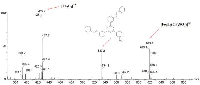 The MM2 model of helicate 1 shows that the whole molecular contains three schiffbase ligands and two Fe(II) ions through the formation of dynamic-covalent (C=N) and the coordinative (N→M) bonds. The coordination configuration of each Fe (II) ion is octahedral, and the distance between two ions is 11.9 Å. There is a hole in the kernel of the complex with approximate size of 5.72 Åx4.17 Å. A counter ion of CF3SO3 - could be bound here, which explains the m/z peak of 619.5 (isotope peaks pattern shown in Table 3S and Figure 22S). The central part of each ligand is a triazine ring which is subject to bind planar aromatic guest molecules by π-π interaction. Also both the inner and outstretched phenyl groups are opened to electron-rich aromatic guests.
