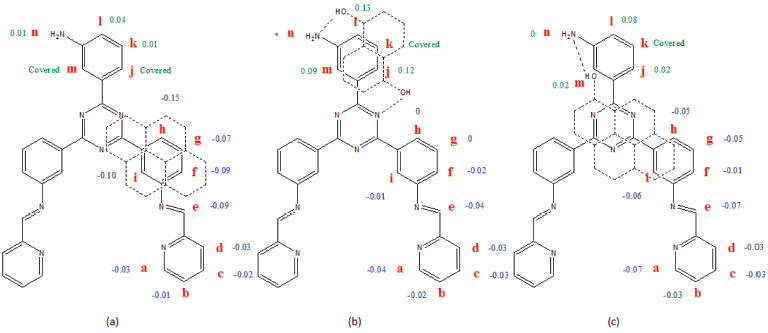 Figure 4. The host-guest interaction patterns of helicate 1 with pyrene (a), naphthalene-1, 5-diol (b) and pyren-1-ol (c) with the shifting of corresponding 1H NMR signals
