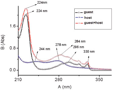 ![]() Figure 5. UV-Vis spectra of host (helicate 1), guest (naphthalene-1,5-diol ) and the mixture of host and guest