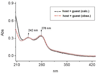 ![]() Figure 6. UV-Vis absorption of host-guest complex (helicate 1 + naphthalene-1,5-diol) compared with observed and calculated value