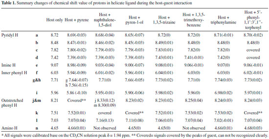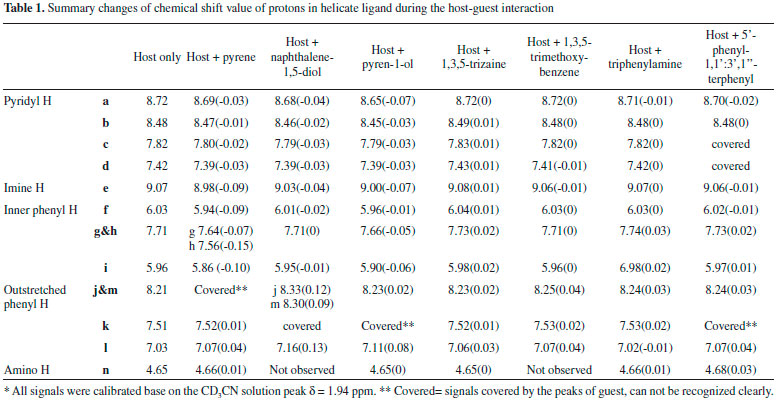 1H NMR studies of host-guest chemistry Seven planar aromatic guests (Table 1) of high symmetry were selected as the testing guests in the solution 1H NMR investigations. The host helicate 1 (0.01 mmol, 1 eq) was dissolved in CD3CN and then into which was added one of the chosen guest molecules (0.1 mmol, 10 eq) respectively. After the process of stirring reaction (at least for 2 h), the whole system was analyzed by 1H NMR to obtain the data of host-guest interaction (Figure 2S to 15S).