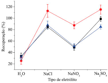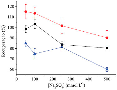 ![]() Figura 2. Efeito da concentraçao de Na2SO4 na recuperaçao dos agrotóxicos de água empregando a extraçao em fase sólida com Si(PDAS). n = 3. ■ Carbendazim, ● diurom e ▲ parationa metílica