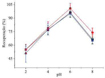 ![]() Figura 3. Recuperaçao dos agrotóxicos da fase Si(PDAS) em funçao do valor de pH da amostra de água. n = 3. ■ Carbendazim, ● diurom e ▲ parationa metílica