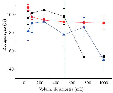![]() Figura 4. Volume de breakthrough para a recuperaçao dos agrotóxicos pela extraçao em fase sólida, empregando a fase Si(PDAS). n = 3. ■ Carbendazim, ● diurom e ▲ parationa metílica