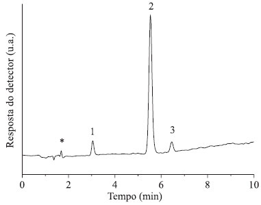 ![]() Figura 5. Cromatograma da separaçao de uma amostra de água fortificada com 0,5 µg mL-1 de (1) carbendazim, (2) diurom e (3) parationa metílica e submetida ao método de extraçao SPE com Si(PDAS) otimizado. Condiçoes cromatográficas: fase móvel MeOH:H2O com eluiçao por gradiente: gradiente: 0-3 min 60% MeOH, 3-8 min, 90 % de MeOH e 8-10 min 60% MeOH. Vazao da fase móvel de 1,0 mL min-1; temperatura de 25° C; detecçao UV a 237 nm