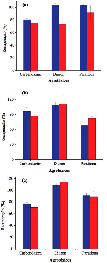 ![]() Figura 6. Recuperaçao dos resíduos de agrotóxicos das amostras (a) A, (b) B e (c) C de água coletadas no Triângulo Mineiro, MG-Brasil, empregando o método de extraçao otimizado e validado com cartuchos Si(PDAS) preparados em laboratório e C18 comerciais