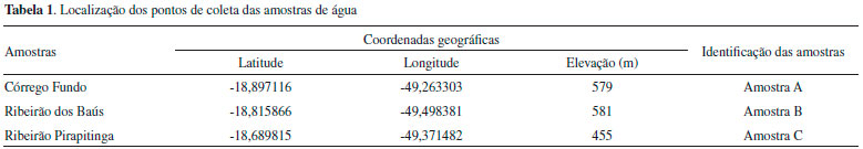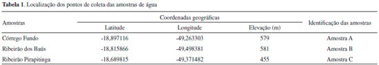 PARTE EXPERIMENTAL Materiais A preparaçao da fase sólida foi realizada com sílica gel com diâmetro de partículas de 40 a 63 µm e de poros de 60 Å (Sigma-Aldrich, Saint Louis, EUA) e poli(dimetilsiloxano-co-alquilmetilsiloxano) (PDAS) (Sigma-Aldrich). Tolueno, clorofórmio, hexano e acetato de etila, todos grau analítico, foram adquiridos da VETEC (Rio de Janeiro, Brasil) ou da Qhemis (Sao Paulo, Brasil). As fases móveis e soluçoes padroes foram preparadas com metanol ou acetonitrila, ambos graus cromatográfico e espectroscópico, que foram adquiridos da JT Baker (Phillipsburg, NJ, EUA). A água ultrapura foi obtida de um ultrapurificador da Megapurity (Billerica, MA, EUA), com resistividade de 18,3 MΩ cm. Todos os solventes foram previamente filtrados, individualmente, em membranas de PTFE de 0,22 µm. Sais NaCl, NaNO3 e Na2SO4 foram adquiridos da Synth (Sao Paulo, Brasil). Os compostos estudados: diurom, parationa metílica e carbendazim foram todos padroes analíticos com grau resíduo de pesticidas (Pestanal), com pureza mínima de 99%, sendo adquiridos da Sigma-Aldrich. Todas as soluçoes dos agrotóxicos foram preparadas inicialmente na concentraçao de 1000 µg mL-1 (soluçoes padrao estoque), individualmente e na forma de misturas. As demais soluçoes foram preparadas a partir das soluçoes estoque. Preparaçao dos cartuchos de extraçao em fase sólida Todos os cartuchos empregados neste trabalho foram preparados em laboratório, seguindo o procedimento desenvolvido por Novais et al.16 Resumidamente, porçoes de sílica pré-ativada a 140 °C por 12 h foram adicionadas a uma soluçao de PDAS a 30% (m/v) em tolueno na proporçao de 1:1:4 (m/m/v), sob agitaçao branda por 3 h à temperatura ambiente (~28 °C) em uma capela. Em seguida, a suspensao do sorvente foi deixada sob repouso em capela para a evaporaçao completa do solvente à temperatura ambiente e sem agitaçao. O material sorvido e seco foi submetido a uma etapa de imobilizaçao térmica em estufa a 110 °C por 12 h para fixaçao do polímero no suporte de sílica. 500 mg da fase sólida Si(PDAS) foram colocados na forma de suspensao (10% m/v em metanol) em seringas de polipropileno de 3 mL. O sorvente foi compactado nas seringas através de centrifugaçao a 2500 rpm por 5 min, sendo retido por filtros de politetrafluoretileno (PTFE). Otimizaçao da extraçao em fase sólida de agrotóxicos de água Para desenvolvimento e otimizaçao de um método de extraçao em fase sólida dos resíduos de agrotóxicos em água, amostras de 50 mL de água ultrapura foram fortificadas com uma soluçao padrao dos agrotóxicos, obtendo uma concentraçao final de 0,5 µg mL-1 de cada composto. Essas amostras foram eluídas em cartuchos Si(PDAS) conectados a um sistema de vácuo Manifold SPE Restek, modelo ResPrep-12 (Bellafonte, PA, EUA). O procedimento de extraçao consistiu na eluiçao de 20 mL de água ultrapura para ativaçao da fase sólida, seguida da eluiçao de 50 mL de amostras de água fortificadas com 0,5 µg mL-1 de cada agrotóxico. Após a passagem da amostra, os cartuchos permaneceram por 5 min sob vácuo para secagem da fase sólida. Em seguida, 5 mL de solvente de menor afinidade (hexano) pelos compostos foram eluídos pelo cartucho para remoçao de potenciais interferentes. Por fim, um volume de 0,5 mL do solvente de eluiçao (metanol) foi passado pelos cartuchos para recuperaçao dos resíduos de agrotóxicos. Para otimizaçao do procedimento de extraçao pelos cartuchos preparados em laboratório, foram avaliados os solventes de limpeza e de eluiçao: metanol, acetonitrila, acetato de etila e hexano; o volume de amostras de água: 50 a 1000 mL; o pH da amostra água; a adiçao de eletrólito: NaNO3, NaCl e Na2SO4, e a concentraçao do eletrólito: 50 a 500 mmol L-1. Validaçao do método O método de determinaçao de resíduos de parationa metílica, diurom e carbendazim em água, empregando a extraçao em fase sólida com cartuchos Si(PDAS) preparados em laboratório, foi validado de acordo com o protocolo preconizado pela Comunidade Europeia, documento SANTE/11945/2015.17 Os seguintes parâmetros analíticos foram avaliados no estudo de validaçao: seletividade, linearidade, efeito de matriz, limites de detecçao e de quantificaçao; precisao (repetibilidade e reprodutibilidade dentro do laboratório), exatidao e robustez. Análise de amostras de águas superficiais coletadas no Triângulo Mineiro, MG-Brasil A aplicabilidade dos cartuchos Si(PDAS) preparados em laboratório foi avaliada, de acordo com o método validado, na extraçao de resíduos de agrotóxicos em três amostras de águas coletadas em ribeiroes localizados dentro de regioes de cultivo de cana-de-açúcar no Triângulo Mineiro, MG-Brasil. As amostras foram coletadas de acordo com as coordenadas geográficas apresentadas na Tabela 1.