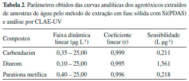 Faixa dinâmica linear, linearidade e sensibilidade Curvas analíticas para cada um dos agrotóxicos foram construídas por padronizaçao externa, ou seja, fortificando amostras de água com diferentes concentraçoes dos compostos e submetendo-as ao método de determinaçao dos agrotóxicos proposta para o uso da fase sólida Si(PDAS). A partir das curvas analíticas, parâmetros como linearidade, sensibilidade e faixa dinâmica linear foram determinados e estao apresentados na Tabela 2.
