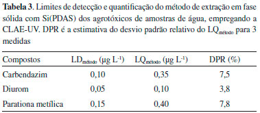 O método proposto apresentou linearidade adequada das respostas obtidas para os agrotóxicos carbendazim, diurom e parationa metílica, com r > 0,99, conforme critérios mais rigorosos estabelecidos pelas agências reguladoras.20 O método se mostrou mais sensível para o diurom quando comparado aos demais compostos. Estes valores de sensibilidade se refletem na faixa dinâmica linear para cada composto, em que se verifica a menor concentraçao quantificável (primeiro ponto da curva analítica) para o diurom frente aos demais compostos. Limites de detecçao (LD) e de quantificaçao (LQ) Os limites de detecçao (LD) e de quantificaçao (LQ) do método de extraçao em fase sólida com o sorvente Si(PDAS) dos agrotóxicos de água foram determinados pelas equaçoes. ![]() em que s é o desvio padrao do coeficiente linear e S o coeficiente angular da equaçao da curva analítica. A partir das equaçoes das curvas analíticas foram entao obtidos os LD e LQ do método para cada um dos agrotóxicos estudados, Tabela 3. Os LQ foram confirmados a partir da injeçao em triplicada de soluçoes padrao dos agrotóxicos preparadas nas concentraçoes equivalentes aos LQ do instrumento para cada composto, considerando o fator de concentraçao do método (LQmétodo x 1000).