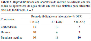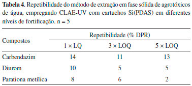 Os valores de LQ do método foram determinados levando em consideraçao o fator de concentraçao da extraçao em fase sólida com o sorvente Si(PDAS) que foi de 1000 vezes. Assim, obtiveram-se LQmet para o diurom como o menor entre os compostos estudados. Os valores de LQmet foram definidos de acordo com o recomendado pelo documento SANTE,17 em que a estimativa do desvio padrao relativo (DPR), para as injeçoes sucessivas na menor concentraçao quantificável para cada composto, ficou abaixo de 20%. Os limites de detecçao e quantificaçao obtidos para o método de extraçao em fase sólida empregando cartucho preparado no laboratório se mostraram competitivos em relaçao a outros métodos empregando sistemas de detecçao mais sensíveis para agrotóxicos em água, devido principalmente ao alto fator de concentraçao alcançado com a SPE.21-23 Precisao (repetibilidade e reprodutibilidade em laboratório) do método A precisao do método proposto foi avaliada segundo a sua repetibilidade e reprodutibilidade em laboratório, de acordo com o preconizado no documento SANTE/11945/2015.17 Para avaliar a repetibilidade do método, foram efetuadas extraçoes dos agrotóxicos fortificados nas amostras de água nas concentraçoes de 1, 3 e 5 vezes o LQmet com cartuchos Si(PDAS). As extraçoes foram realizadas em 5 repetiçoes, empregando o método proposto sob as mesmas condiçoes experimentais. Na Tabela 4 sao apresentadas as estimativas do desvio padrao relativo obtidas para cada agrotóxico, em três níveis de fortificaçao, após a extraçao em fase sólida com Si(PDAS) das amostras de água.