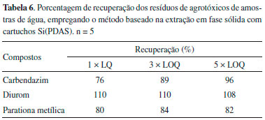 As estimativas dos desvios padrao relativos apresentados na Tabela 5 representam as dispersoes das recuperaçoes obtidas em três dias diferentes para cada nível de fortificaçao dos agrotóxicos estudados ao empregar o método otimizado neste trabalho. Os resultados indicam que nao existe variaçao significativa da resposta, DPR < 17%, quando o método é aplicado em dias distintos para extrair os agrotóxicos de amostras de água, estando em conformidade com o preconizado pelo documento SANTE,17 podendo, portanto, ser considerado como um método reprodutível dentro do laboratório. Exatidao do método (Ensaios de recuperaçao) Para avaliar a eficiência dos cartuchos Si(PDAS) em extrair e concentrar os resíduos de agrotóxicos de amostras de água pelo método proposto, amostras fortificadas em três níveis de concentraçao dos agrotóxicos: 1x, 3x e 5x LQmet foram submetidas a ensaios de recuperaçao. A porcentagem de recuperaçao para cada agrotóxico foi determinada a partir da quantidade inicial adicionada dos padroes dos agrotóxicos nas amostras de água e a quantidade obtida nos extratos, de acordo com o grau de fortificaçao. De acordo com o documento SANTE/11945/2015,17 para que um método seja considerado de boa exatidao, a taxa de recuperaçao dos resíduos de agrotóxicos deve estar entre 70 a 120%. A Tabela 6 apresenta a porcentagem de recuperaçao para cada agrotóxico a partir de 5 repetiçoes em três diferentes níveis de fortificaçao da amostra após a aplicaçao do método proposto.