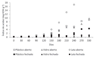 ![]() Figura 1. Variaçao da acidez de biodiesel de óleo de caixa de gordura armazenado em condiçoes diferenciadas