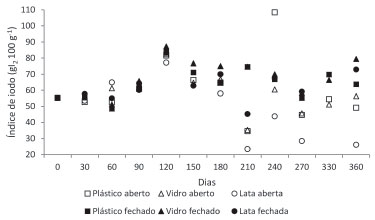 O índice de iodo também varia com o tipo de matéria-prima empregada na produçao de biodiesel, devido à composiçao dos triacilgliceróis em cada matriz.38,39 Por este motivo, é possível notar que os índices de iodo dos biodieseis de óleo de soja virgem e de fritura diferem do biodiesel oriundo do óleo de caixa de gordura. Observando a variaçao do índice de iodo deste biodiesel sob condiçoes de armazenamento distintas, foi notada uma maior preservaçao das insaturaçoes para a amostra armazenada em vidro fechado. Seu comportamento está mostrado na Figura 2.