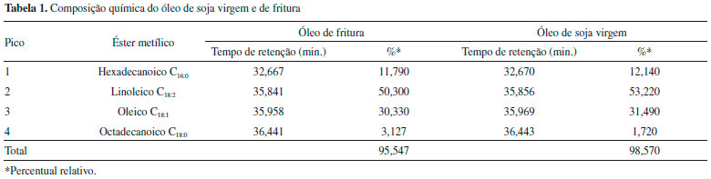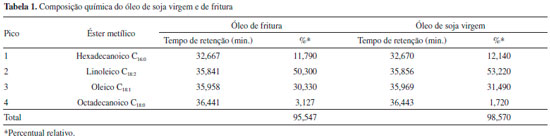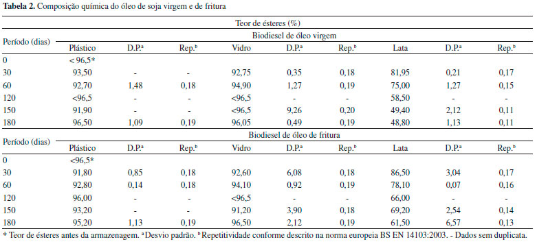 RESULTADOS E DISCUSSAO A estabilidade de um biodiesel é a resistência deste a um conjunto de modificaçoes químicas que sao inerentes ao processo de estocagem por longos períodos. O contato com o ar, calor e água sao os principais fatores que afetam a estabilidade ao armazenamento.34 Este trabalho avaliou alguns dos principais parâmetros indicadores de estabilidade do biodiesel que podem ser alteradas no processo de estocagem. Os recipientes utilizados foram frascos de plástico e vidro com capacidade de 100 mL, e lata com capacidade de 500 mL. Sendo que o volume de biodiesel armazenado nos três recipientes foi de 100 mL. Caracterizaçao dos óleos A composiçao percentual relativa do óleo de soja virgem e de óleo de fritura está apresentada na Tabela 1.