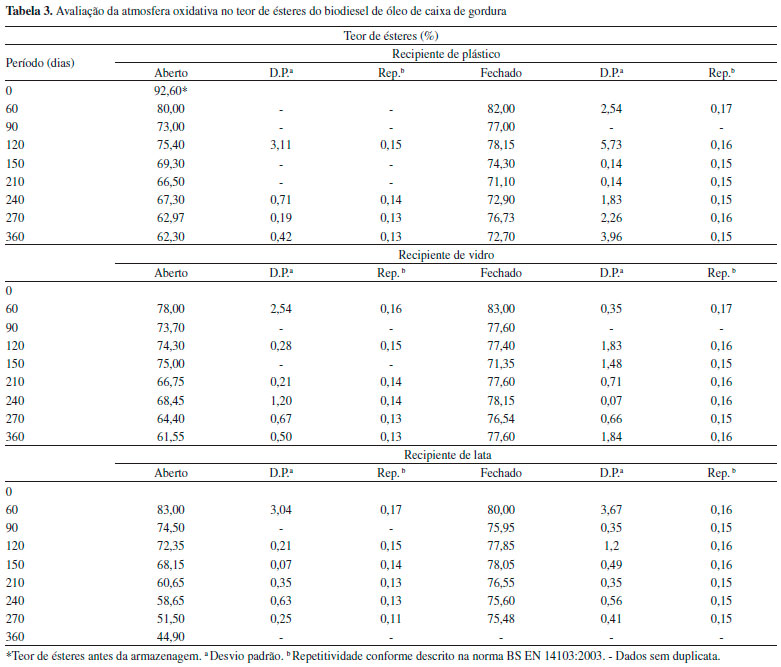 Os valores de teor de ésteres do biodiesel de caixa de gordura estao listados na Tabela 3. A amostra de biodiesel de óleo de caixa de gordura foi avaliada também quanto à presença ou ausência de uma atmosfera oxidativa.