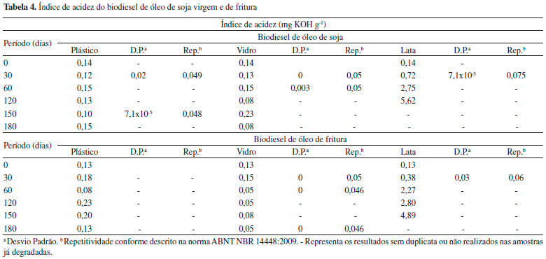 A amostra de biodiesel de caixa de gordura obteve maior alteraçao do teor de ésteres quando exposta à atmosfera oxidativa. Com relaçao à estocagem, o vidro, principalmente na ausência de nitrogênio, foi o recipiente que melhor conservou as propriedades e a composiçao dos biodieseis. A embalagem metálica, mesmo em atmosfera de gás inerte, apresentou os menores teores de ésteres. Segundo estudos envolvendo a reaçao de oxidaçao de amostras de biodiesel de fontes alternativas, o efeito catalisador de metais, como cobre, confirma a influência na modificaçao e degradaçao da estrutura de ésteres derivados de ácidos graxos, especialmente nas insaturaçoes.15 Após cento e oitenta dias de armazenamento, observou-se que os teores de ésteres do biodiesel de óleo de soja virgem armazenado em recipiente lata passou de 81,95% para 48,8% em massa, o que pode ser explicado pelo efeito catalisador do metal da lata, além do volume de 400 mL nao preenchido com biodiesel. Indice de acidez O índice de acidez e a estabilidade à oxidaçao foram os primeiros ensaios realizados, para evitar o contato das amostras com o oxigênio e com a umidade do ar. Leung e colaboradores (2006) avaliaram o índice de acidez de biodiesel de óleo de colza sob diferentes condiçoes e comprovaram que a temperatura, a presença de água e o ar atmosférico, aumentam o índice de acidez, o que indica uma maior taxa de degradaçao da amostra.35 Para as amostras de biodiesel de óleo de soja virgem e de fritura, o índice de acidez inicial foi 0,14 e 0,13 mg KOH g-1, respectivamente. Com o passar do tempo de estocagem, verificou-se que para ambos os biodieseis, armazenados em frascos de vidro ou plástico, as alteraçoes no índice de acidez obtiveram pouca variaçao, em até 0,1 mg KOH g-1. Já para os mesmos biodieseis estocados em lata, as mudanças ficaram acima de 4,0 mg KOH g-1 (Tabela 4).