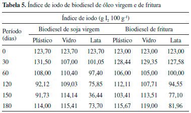 Após duzentos e quarenta dias de armazenamento, o biodiesel de óleo de caixa de gordura acondicionado em lata aberta com acidez inicial de 0,22 mg KOH g-1 passou a apresentar o índice de acidez igual a 17 mg KOH g-1, com isso, o teor de ésteres também sofreu uma diminuiçao notável, de 92,6% para 45,0%, devido a degradaçao. Pressupoe-se, com base na literatura, que isso ocorreu porque estes ésteres foram mantidos em um ambiente favorável à hidrólise (lata, com presença de atmosfera oxidativa), o qual levou à formaçao de ácidos graxos livres. Por meio da derivatizaçao e análise por CG-EM, o teor relativo de ácidos graxos livres foi revelado, totalizando 34,34%, que corresponde a 15,50% de ácido palmítico, 12,38% de ácido linoleico e 6,46% de ácido esteárico. Indice de iodo O índice de iodo está diretamente relacionado com a estabilidade à oxidaçao e fornece o teor de insaturaçao de uma amostra. Todavia, este ensaio por si só nao pode predizer a estabilidade do biodiesel, uma vez que quantifica as ligaçoes duplas sem distinçao da sua posiçao na molécula, o que é substancial em termos de reatividade. Assim, o índice de iodo é importante para confirmar, juntamente com os outros testes, se as amostras de biodiesel têm a possibilidade de formar subprodutos lipídicos, os quais poderao causar entupimento em um motor.15 No Brasil, nao há exigência quanto aos limites de índice de iodo para o biodiesel, de modo que a legislaçao vigente solicita apenas a averiguaçao deste parâmetro (Resoluçao ANP N° 14 de 11.05.2012). Pela Norma Europeia, o índice de iodo deve estar próximo de 120 g I2 100 g-1. As amostras de biodiesel de óleo de soja virgem e de fritura apresentaram valores de iodo iniciais muito similares, sendo 123,70 g I2 100 g-1 e 123,00 g I2 100 g-1, respectivamente. Com o passar do tempo, ambas sofreram diminuiçao do índice de iodo (Tabela 5), sendo que as amostras armazenadas em latas tiveram reduçoes mais significativas, causadas pela perda das duplas ligaçoes. Esse efeito pode ser mais uma vez atribuído ao efeito catalítico dos metais constituintes do recipiente, que favorecem a ocorrência de reaçoes químicas.