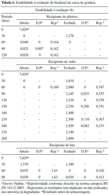 Estabilidade à oxidaçao A oxidaçao pode ser promovida por temperatura elevada, presença de materiais estranhos, tais como metais, condiçoes de estocagem, absorçao de água, presença de microrganismos, por auto oxidaçao natural e pelo contato com ar.20,45 Analisando as condiçoes de estocagem do biodiesel de óleo de caixa de gordura (em plástico, lata, vidro, na presença e ausência de nitrogênio), verificou-se que somente a amostra armazenada em frasco de vidro em presença de nitrogênio se manteve preservada por mais tempo (Figura 4, Tabela 6), sendo, 7,420 h em seu tempo inicial e 2,890 h após trezentos e sessenta dias. As demais amostras apresentaram poucos minutos de estabilidade.