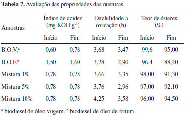 A oxidaçao dos biodieseis analisados pode ser atribuída a fatores conhecidos teoricamente, contudo, alguns ensaios realizados permitiram inferir que as causas da oxidaçao foram a natureza insaturada do triacilglicerol, o contato com atmosfera oxidativa e a estocagem em reservatório metálico com açao catalítica. Outros testes como a determinaçao do teor de água e os ensaios microbiológicos ainda podem ser realizados para melhorar a compreensao sobre os motivos da oxidaçao. Pela legislaçao brasileira, a estabilidade à oxidaçao mínima deve ser de 6 horas a 110 °C, o que leva a aconselhar que a utilizaçao deste biodiesel deve ser imediata, caso nao sejam adicionados antioxidantes, dado que longos períodos de estocagem contribuem para a sua degradaçao.46 Avaliaçao da estabilidade das misturas As misturas foram obtidas por meio da adiçao de biodiesel de óleo de fritura com biodiesel de óleo virgem, nas proporçoes de 1%, 5% e 10% (m/m). Os resultados da avaliaçao das propriedades das misturas no início e após sessenta dias de estocagem estao apresentados na Tabela 7.